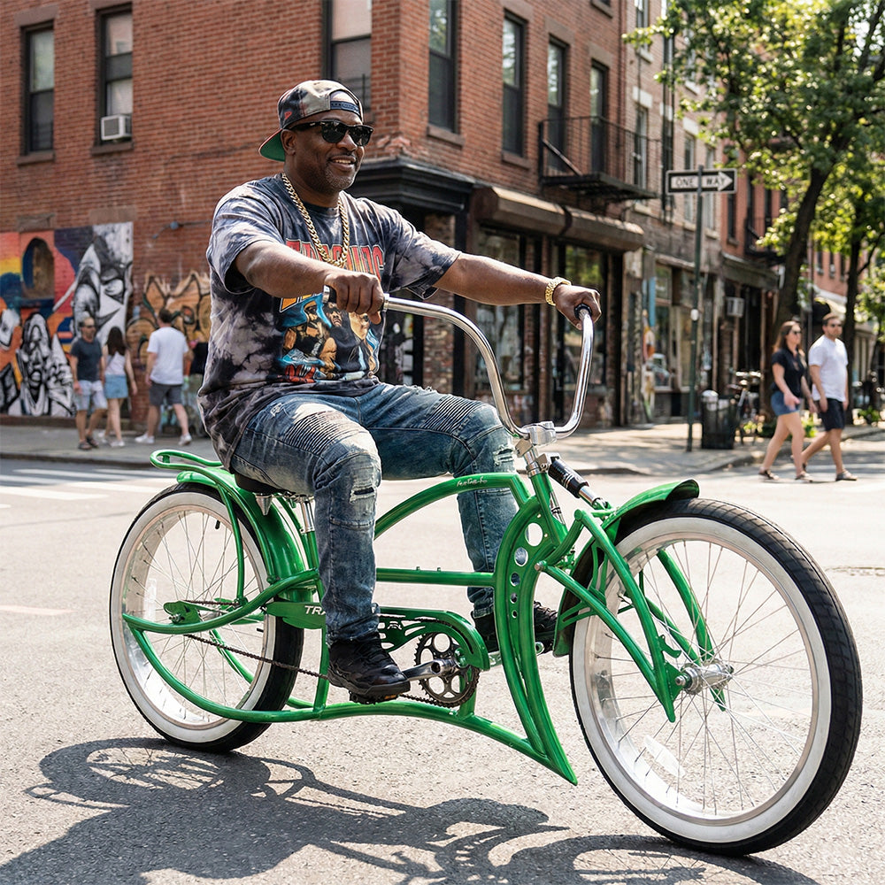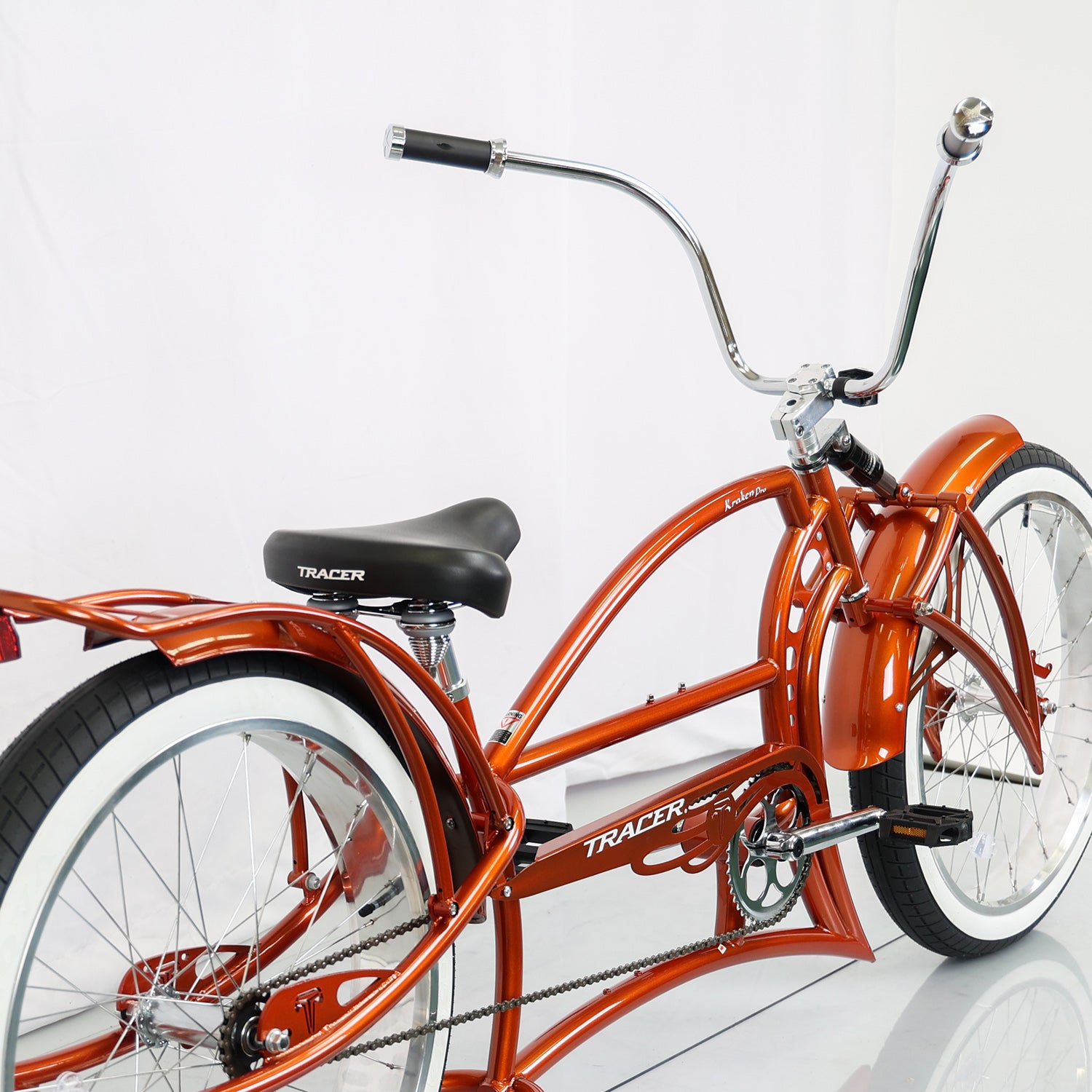 The Tracer Kraken Pro 26" Stretch Cruiser Bike delivers a smooth and stylish ride with a spring classical fork and coaster brake. Featuring fat white wall tires (3.5" front, 4" rear), it provides exceptional grip and comfort. The single-speed setup and BMX cranks ensure simplicity and durability, while the Hi-Rise steel handlebar adds comfort and control. Perfect for cruising or custom builds, this bike combines performance with eye-catching design.
